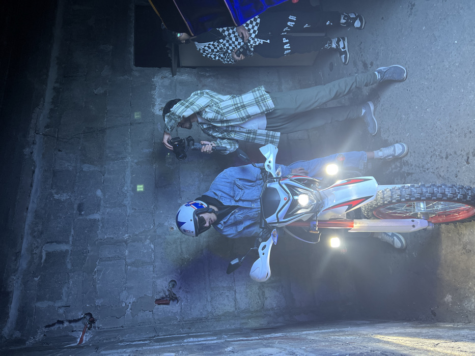 Three people occupy a gritty, dim setting. One, wearing a helmet and denim jacket, is astride a brightly lit dirt bike. Another person is holding a camera, wearing a plaid shirt and khaki pants. Above them, a third individual in a checkered jacket lies on a skateboard. The backdrop is a rough concrete wall, with traces of electrical wiring and embedded square reflectors. The lighting is uneven, casting strong shadows, particularly from the bike's headlights.
