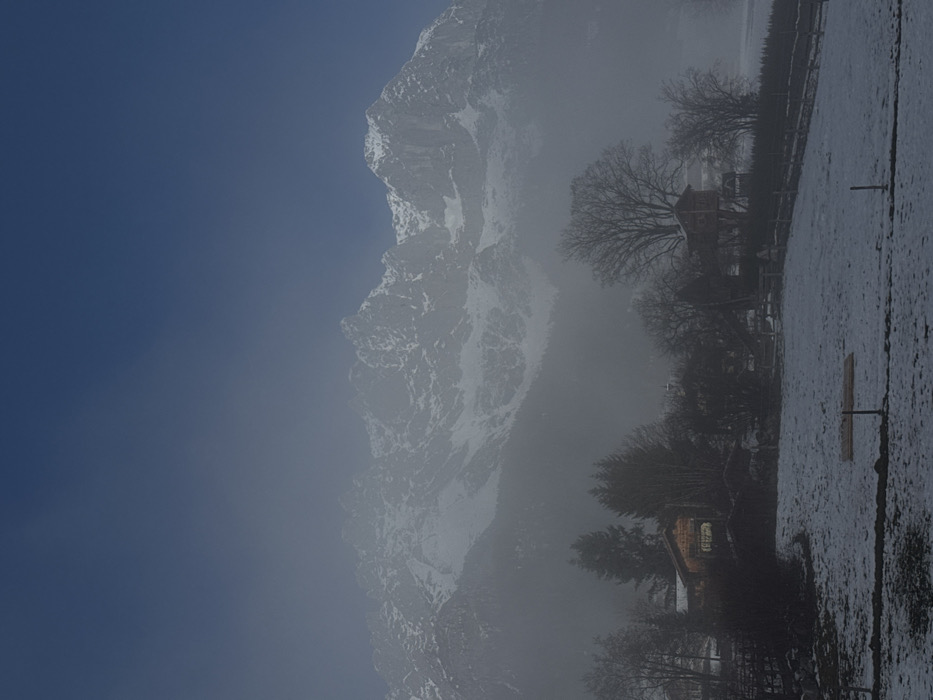 This image captures a snow-covered winter scene in Going am Wilden Kaiser, Austria. The upper third of the frame features a clear, deep blue sky. Below, the rugged, snow-capped peaks of the Wilder Kaiser mountain range dominate the background, partially obscured by a pervasive atmospheric haze that extends into the midground. In the midground, a cluster of buildings, typical of alpine architecture, is visible, interspersed with bare deciduous trees and dark evergreen conifers. One timber-clad building displays a warm yellow illumination from its windows. The foreground consists of a flat, snow-covered field, traversed by faint fences and featuring a horizontal wooden plank-like object resting on the snow. No individuals or overt activities are present. The overall scene suggests a cold, possibly misty, winter day.