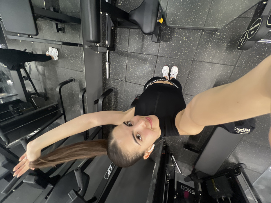An overhead selfie taken inside a gym facility in Daegu, South Korea, specifically indicated by "EXCO" branding on an exercise machine