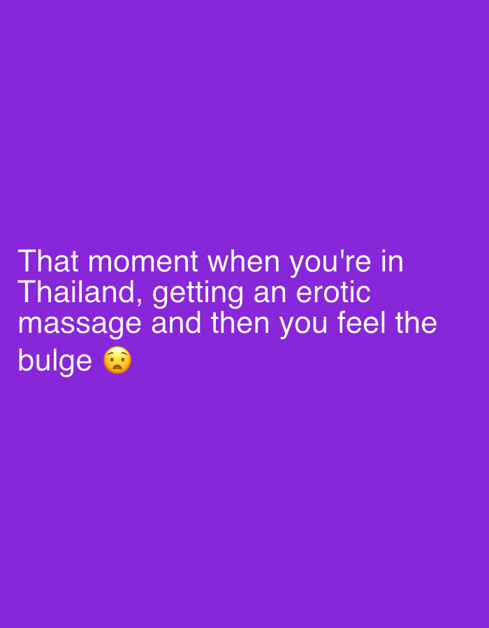 The image displays a solid medium-purple background. White sans-serif text is centrally aligned and positioned in the lower half of the frame. The text reads: "That moment when you're in Thailand, getting an erotic massage and then you feel the bulge". Following the word "bulge" is a yellow grimacing face emoji (😬). The image itself does not visually depict any specific location within Baan Chaweng, Thailand, nor any physical subjects, objects, or actions beyond the text content.