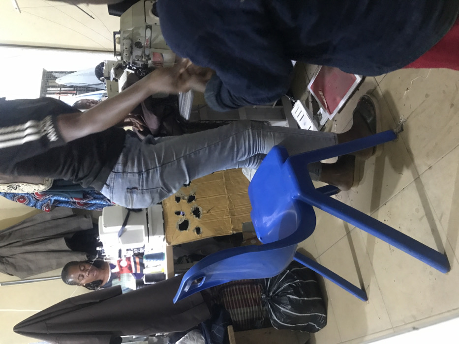 Inside a sewing workshop, a person sits at a sewing machine, wearing a black shirt with white stripes and light blue jeans. Beside them, another individual clad in a dark blue shirt and red garment leans over. A blue plastic chair rests on the floor beside the person operating the machine. Other sewing machines and a box with circular holes are visible in the background, along with fabrics and clothing items. The floor appears tiled.