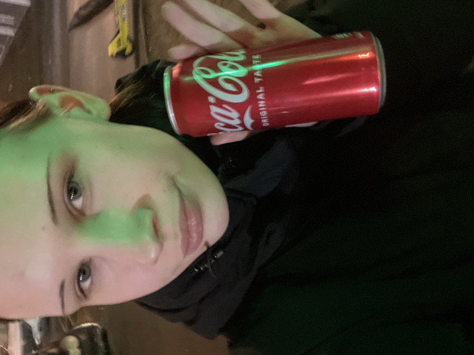An individual, appearing to be a young adult with light skin and dark hair, is depicted in a close-up, chest-up selfie taken outdoors at night. The subject faces the camera directly with a neutral expression. A prominent green light source illuminates the left side of the subject's face and reflects off the red Coca-Cola "Original Taste" can held in their right hand, which is presented towards the camera. The individual wears a dark, possibly black, zipped jacket or hoodie. A small silver piercing is visible on the helix of the subject's right ear. The background is blurred, characteristic of an urban environment at night. On the left, a dark-colored vehicle is partially visible. On the right, a distinctive bright yellow object, consistent with an electric scooter, is partially visible and out of focus. The specific location within the city of Saint Petersburg, Russia, cannot be determined from the visual details present in this image.