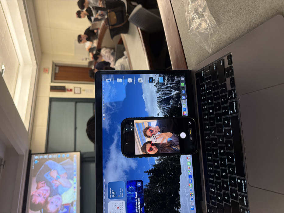 laptop and a phone in a classroom setting. The laptop screen displays a mountain landscape, with app icons and widgets visible. A phone is placed on the laptop, showing a selfie of two people wearing sunglasses, with the camera app open. In the background, other students are seated, with a projected image on a screen. An exit door and windows are also visible. The laptop keyboard is partially visible, along with a plastic bag.