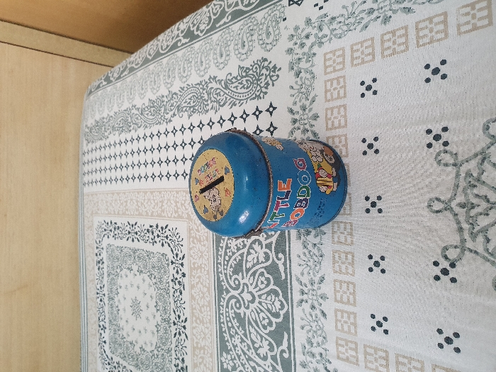 - "The scene depicts a blue cylindrical metal piggy bank, labeled "LITTLE BOBDOG" in colorful text, resting on a patterned bedspread or coverlet" by FM-Ufqpo2, licensed under CC BY 4.0