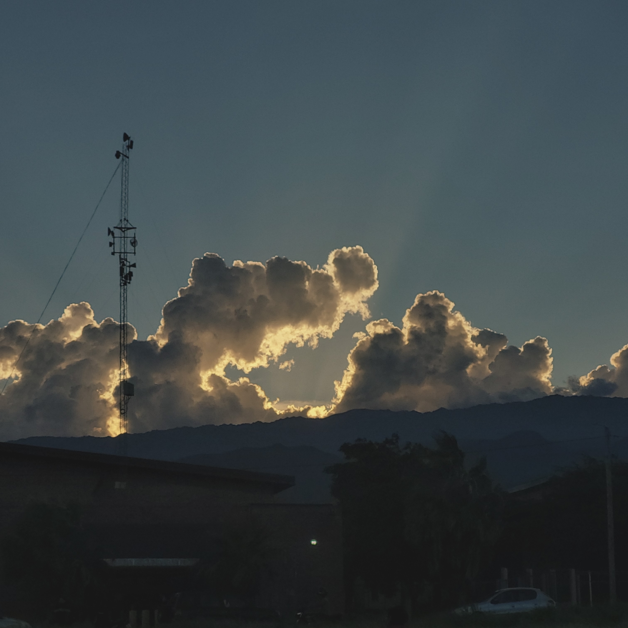 The image depicts a landscape in San Fernando del Valle de Catamarca, Argentina, captured at dusk or dawn. A transmission tower stands prominently on the left side of the frame. Cumulus clouds fill the sky, back-lit by the sun, casting rays of light through the gaps between them. The Andes mountains are discernible in the background, behind the clouds. Buildings are faintly visible in the lower part of the frame, with dark foliage and an uncovered hatchback car to the right. No people are visible in the image. The image is dominated by the interplay of light and shadow, creating a dramatic scene.