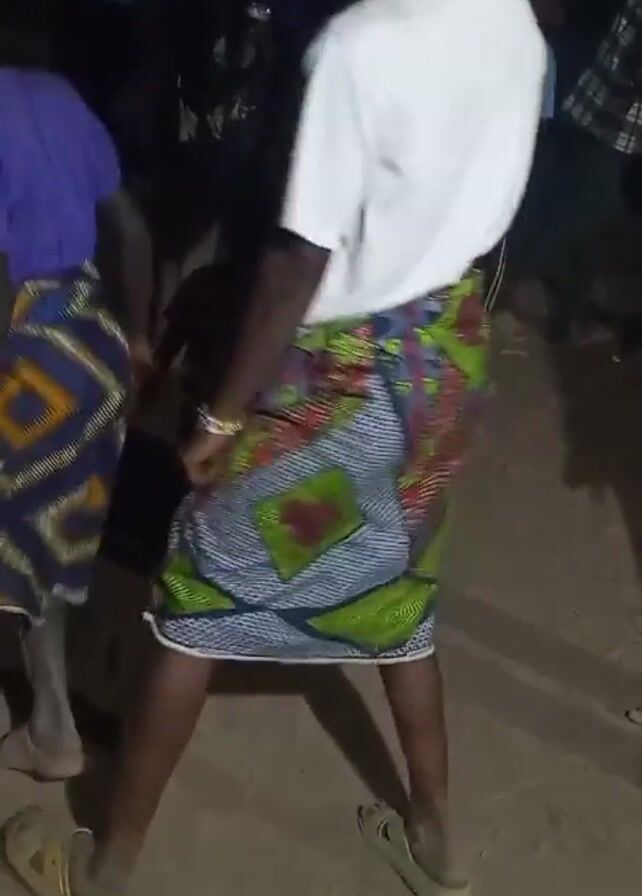 group of people dancing outside at night. Two of the dancers, a child and a young woman, are prominent in the frame, wearing colorful fabric wraps as skirts. The young woman is in a white t-shirt and the child in a purple t-shirt. Other people are visible in the background. The ground is a sandy color. Loud music is playing. The camera moves slightly, following the dancers.