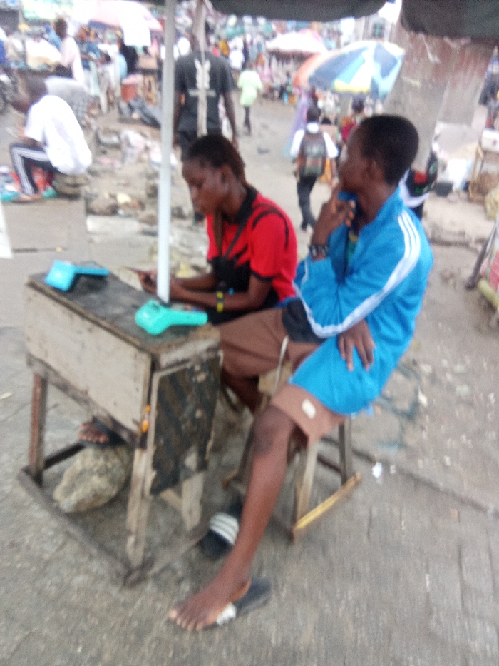 The image depicts an outdoor market or street scene in Satellite Town, Nigeria, centered on two individuals operating a makeshift stall