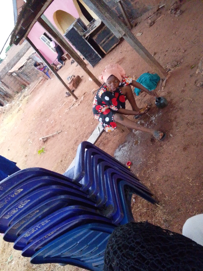 A woman in a floral dress and headwrap sits on the ground, pouring liquid from a dark container onto a wet spot. In the foreground are stacked blue chairs. The ground is red dirt. In the background, a building with a pink archway and window is visible. A wooden structure provides overhead cover. Another person sits on a blue chair farther in the background.