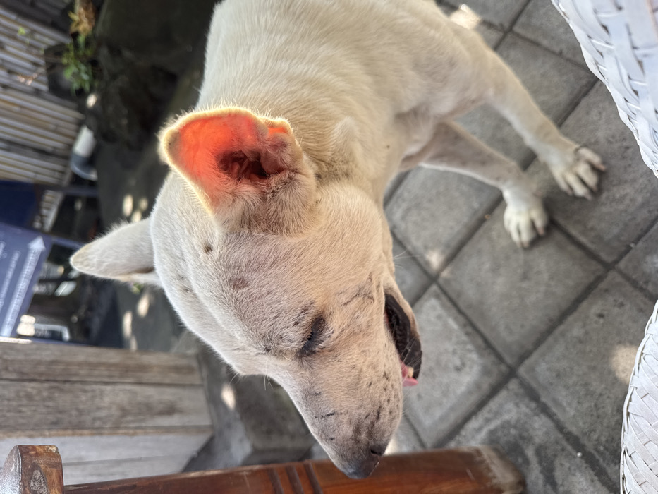 A cream-colored dog with short fur stands on light grey square paving stones, oriented in profile facing left. Its mouth is slightly open, revealing a pink tongue, consistent with panting. Dark flecks and minor abrasions are visible on its muzzle and forehead. The dog's right ear is strongly backlit by direct sunlight, rendering it translucent with a distinct orange-red coloration. The foreground features a partial view of a white woven object, likely a piece of furniture. To the left, a vertical light brown wooden pillar is present. The background consists of weathered wooden structures, a partially visible blue sign, and a bamboo-like fence or wall with sparse foliage, all illuminated by strong daylight. This scene is located in the city of Unknown, Indonesia.