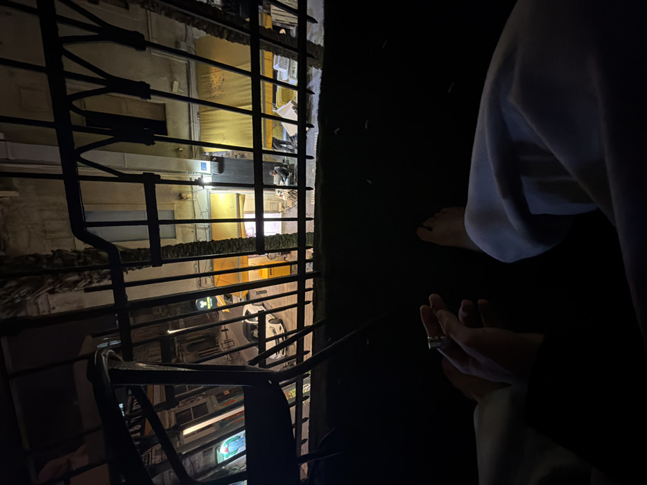 The image depicts a nighttime urban scene captured from an elevated position, likely a balcony, overlooking Sikhs Street in the German Colony of Haifa, Israel. In the immediate foreground, a person's lower body is visible. A left hand, adorned with a ring, holds a lit cigarette. The right leg is bare (barefoot) and partially covered by light-colored trousers. A dark metal balcony railing, featuring ornate arch-like designs, dominates the upper foreground, framing the view of the street below. The street level reveals a narrow thoroughfare, partially illuminated by artificial light sources. A white sedan is parked on the left side of the street. On the left, a business identified by a prominent yellow awning and a sign reading "PAPA'S PUB" is brightly lit, showing its interior. Adjacent to this, a building entrance appears dark, featuring a blue fixture on its facade. Further to the right, another commercial establishment is present, characterized by a large, extended yellow fabric awning. Two individuals are seated at a small outdoor table near this establishment, illuminated by its light. Additional chairs and undefined objects are visible near the building facades. Tall palm trees rise from the street level, partially obscured by the railing and buildings. The background consists of multi-story stone buildings, indicating a densely built urban environment. The sky is dark, consistent with a nighttime setting. The scene is lit by various artificial lights, creating areas of strong illumination and deep shadow.
