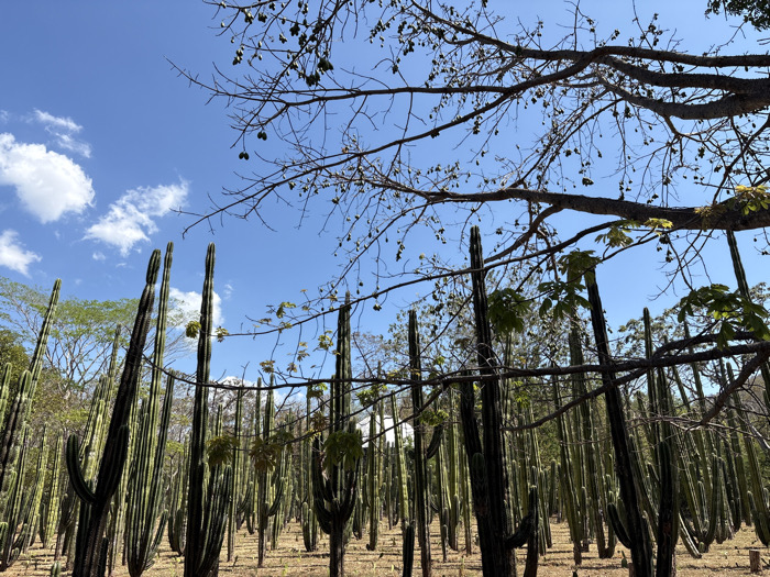 The image captures an outdoor scene, likely a botanical garden or natural habitat, in Unknown, Costa Rica, characterized by a dense arrangement of tall, columnar cacti