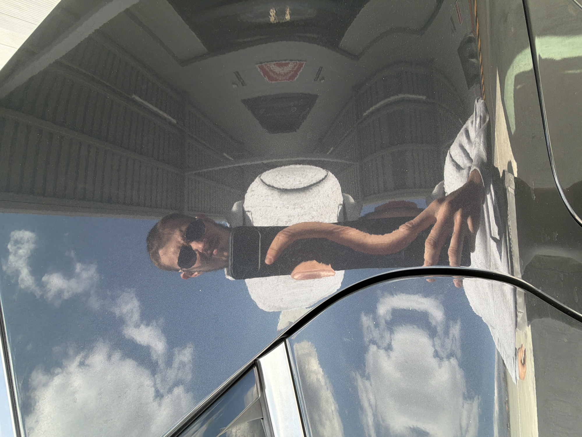 reflection on the surface of a dark-colored car hood. The reflection includes a person wearing sunglasses and holding a smartphone, an indoor space with a corrugated metal roof, a white object that appears to be a container or bucket, clouds, and the sky. There is no indication of the location in Sofia, Bulgaria.