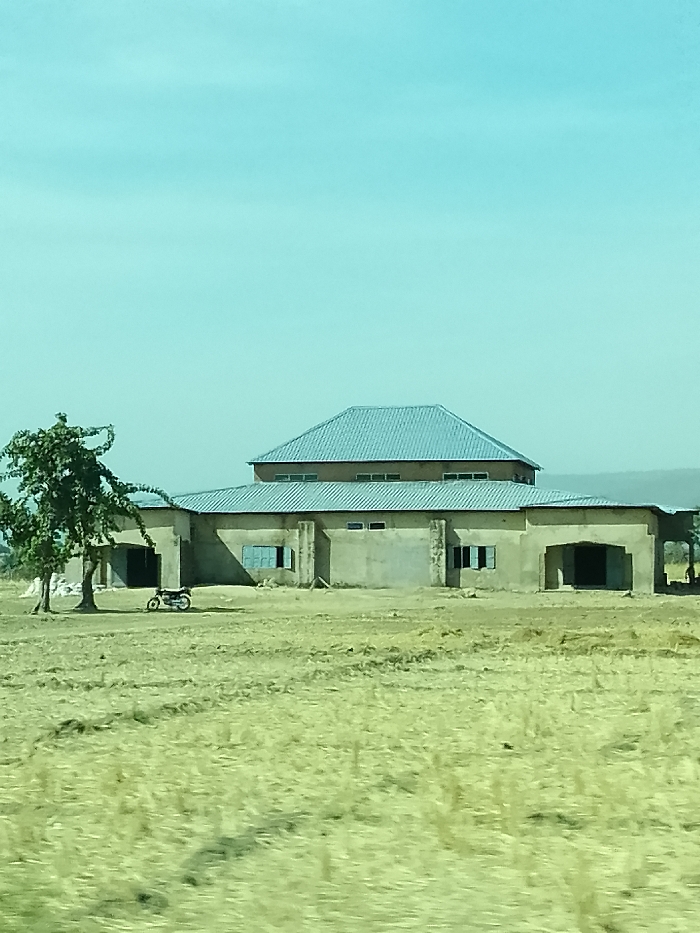 In Minting Chip, Nigeria, the image depicts a daytime scene featuring a multi-sectioned building situated in a dry, open field under a clear, light blue sky
