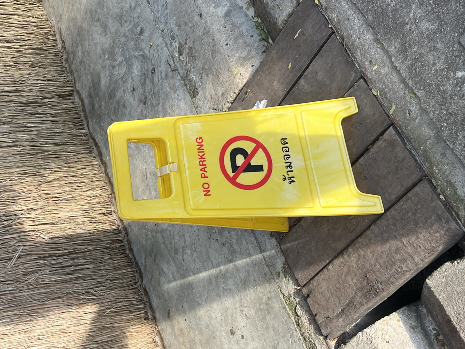 - "An outdoor scene in Baan Chaweng Noi, Thailand, features a yellow A-frame plastic 'NO PARKING' sign positioned on concrete pavement" by FM-Nu6Ik2, licensed under CC BY 4.0