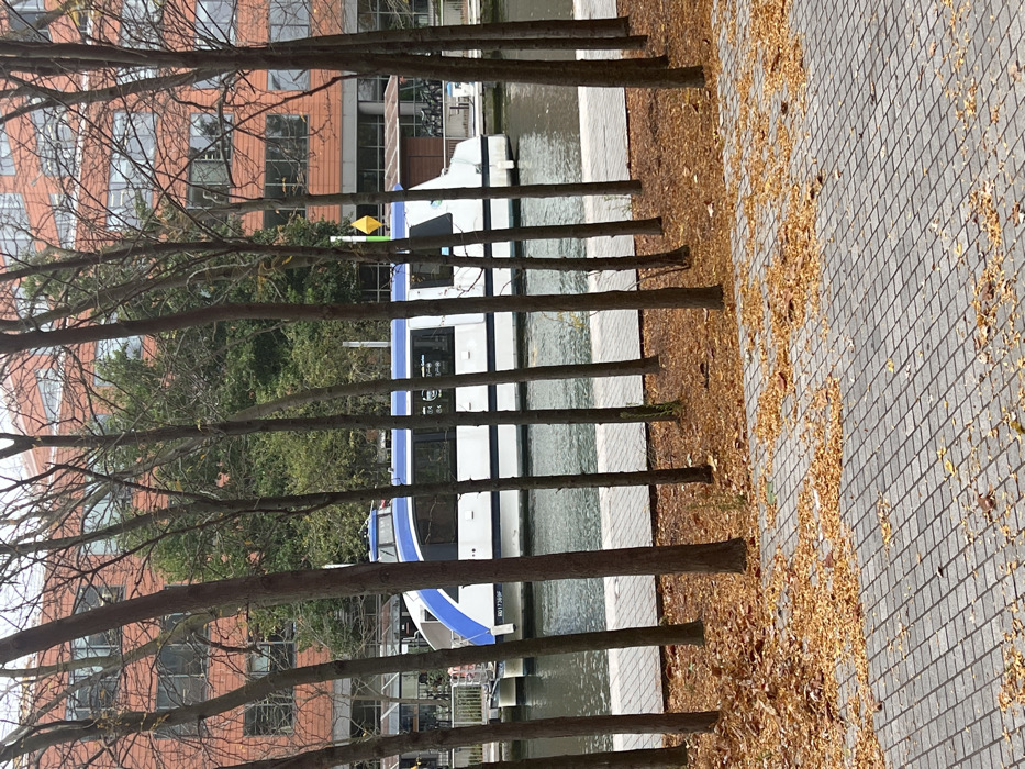 The image depicts an autumn scene along a canal in Aubervilliers, France. In the foreground, a grey cobblestone pathway is partially covered with scattered brown and orange fallen leaves. Immediately behind this pathway, a narrow strip of ground is densely covered with similar autumn foliage. A linear arrangement of slender, bare deciduous trees with dark brown trunks extends vertically across the midground, partially obscuring the view. Beyond the trees, a calm body of water, likely a canal, is visible. Along its bank, a light grey paved embankment runs parallel to the waterway. A white and blue catamaran-style boat, identified by "RD17360F" on its hull, is moored or docked on the water, positioned horizontally within the frame. The boat features dark-tinted windows. A yellow, conical buoy is visible to the right of the boat. In the background, a multi-story modern building with an orange-red brick or panel exterior and numerous rectangular windows is partially visible through the bare tree branches. Green foliage from other trees is present between the bare trees and the background building. No people or discernible actions are visible in the scene.