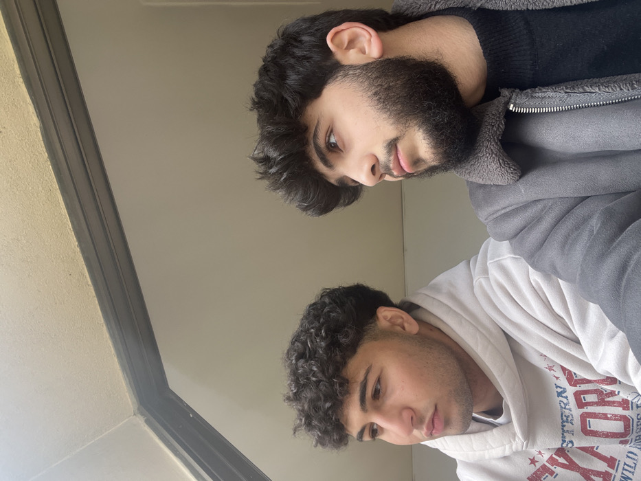 The image displays two males positioned side-by-side, observed from a slightly low angle in what appears to be an indoor setting