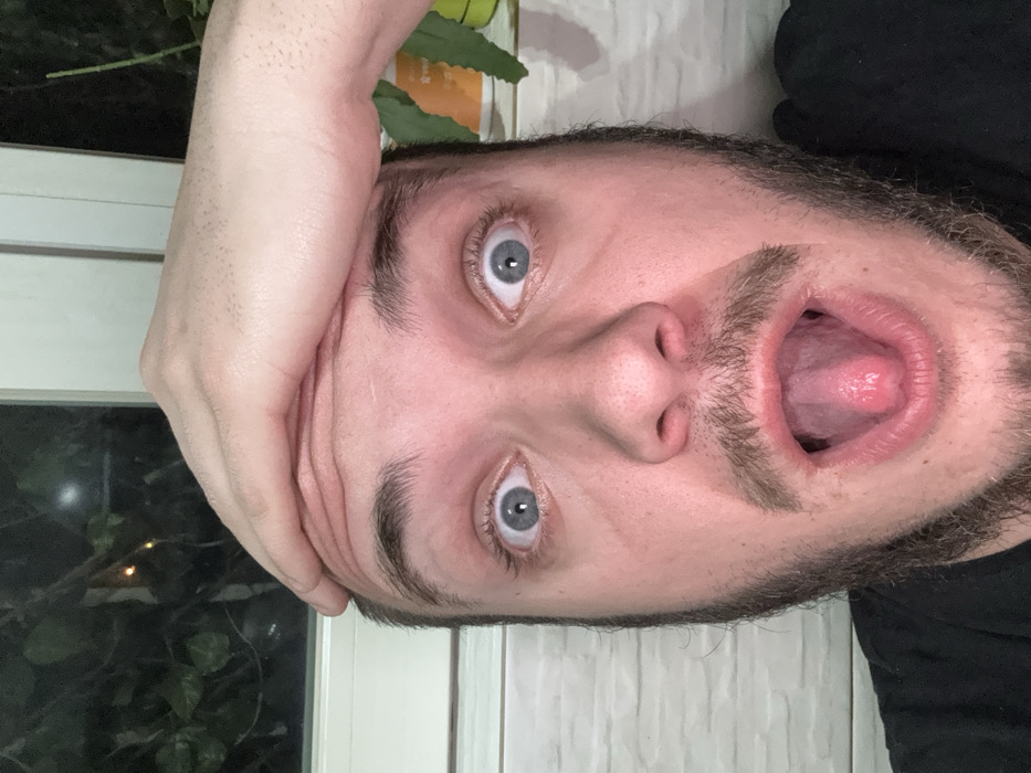 A close-up, portrait-oriented image depicts a single adult male indoors. The subject has a light complexion, dark hair, and a dark brown beard and mustache. His light blue eyes are wide open with dilated pupils, directed straight at the viewer. His mouth is open, revealing a pink tongue extended slightly forward. His right hand is placed on his forehead, palm down, with fingers slightly splayed. He is wearing a dark-colored shirt, visible at the bottom left. The background to the left features a white-framed window looking out onto dark foliage and a faint distant light source, suggesting an exterior at night or in low light. To the right, a white brick or tile wall is visible, along with a green potted plant and an orange-labeled container partially obscured. The scene is illuminated by artificial light. The specific location within Sofia, Bulgaria, cannot be determined from the visual evidence provided in the image.