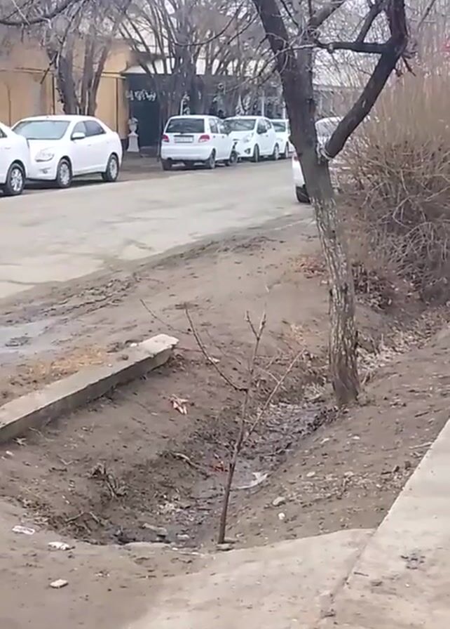 street scene on a cloudy day. Several white cars are parked along the street, adjacent to buildings. A bare tree stands near the sidewalk, and a muddy ditch runs alongside. A person walks on the sidewalk toward the camera. There's a slight audio background of music.