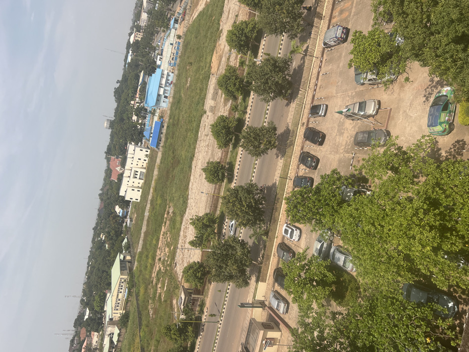 An elevated view captures an urban scene in Shaba, Nigeria, under a hazy sky. In the foreground, a paved parking lot is visible, occupied by approximately 20 vehicles, predominantly sedans and SUVs of various colors. Several large green trees partially obscure some parked cars. A light-colored sedan in the parking lot displays a Nigerian flag on a pole attached to its roof. A green hatchback with decals is partially visible at the bottom right. Adjacent to the parking area on the left is a small, light-colored building. Separating the foreground from the midground is a multi-lane asphalt road, featuring a median strip densely planted with trees. One white sedan is observed traveling on the road from right to left. Beyond the road lies a broad expanse of unpaved land covered with dry grass and dirt, bordered by a fence. In the background, a cluster of buildings rises above the tree line. These include a light-colored building with a green roof on the left, and two prominent multi-story white buildings in the center-right. Further into the distance, a red-roofed building is discernible, alongside additional structures interspersed within dense vegetation. A large water tower and several communication towers are visible on the horizon. No discernible human figures are clearly performing actions or interactions within the scene.
