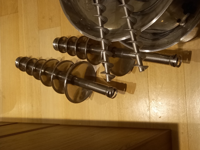 - "Three stainless steel auger-like devices and a bowl are arranged on a light wood surface" by FM-MtLfs2, licensed under CC BY 4.0