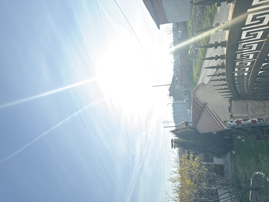 This image depicts a semi-rural residential street scene in Nikolaevo, Bulgaria, under bright daylight with a clear blue sky. The sun, positioned in the upper right quadrant, causes significant lens flare across the upper and middle right portions of the frame. Two distinct contrails are visible in the upper sky, one extending diagonally from the upper left towards the center, and another fainter one intersecting it horizontally. In the foreground, a dark, ornate metal gate with a geometric Greek key pattern and pointed finials is partially visible on the right, suggesting an entrance to a property. Adjacent to the gate, a stone pillar supports a low, light-colored wall topped with red-tiled coping, extending towards the left. Behind this wall, a manicured lawn is present, along with several potted plants, some in red planters mounted vertically on the wall. A deciduous tree with yellow blossoms stands on the far left. Further back, two tall, slender coniferous trees flank a building with a visible chimney on its roof. The midground features a dirt or gravel road curving uphill to the right. On the right side of this road, a house with a red-tiled roof and light-colored walls is partially visible, appearing somewhat weathered. Another building with a similar roof structure is visible further up the road on the left. Overhead utility lines are present throughout the scene. In the background, a forested hill rises, with a large electricity pylon discernible near its crest. No individuals or animals are visible, and no discernible actions or interactions are taking place.