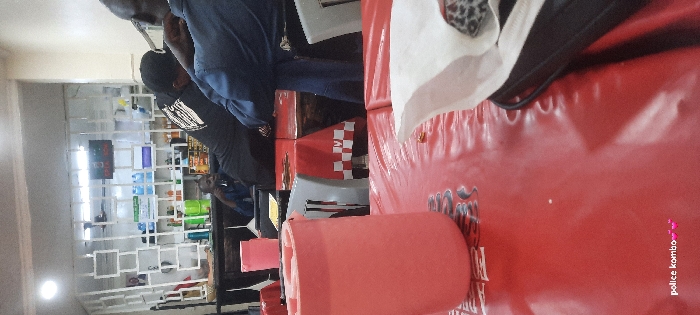 The image portrays an indoor scene within an establishment in Homa Bay, Kenya, indicative of a casual eatery or a retail space offering refreshments