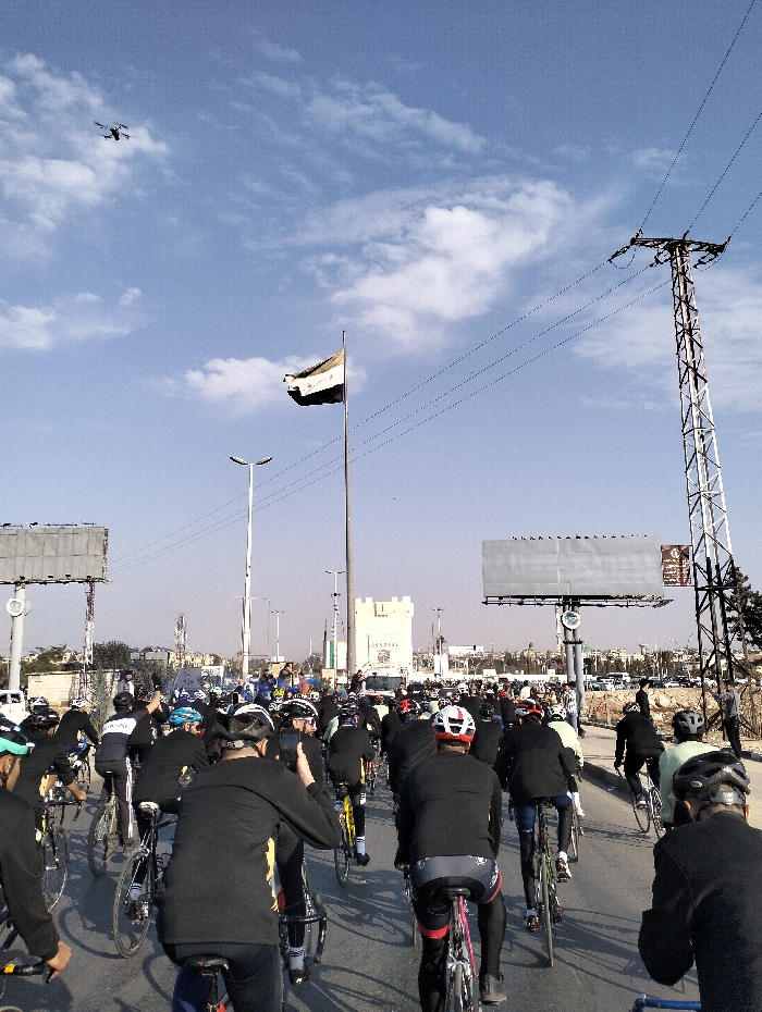 A large group of cyclists, mostly clad in black long-sleeved shirts and helmets, rides along a road. An Egyptian flag flies in the distance, along with billboards and a control tower. Overhead, a drone is visible against a blue sky dotted with clouds. Power lines stretch across the scene, supported by a metal tower.