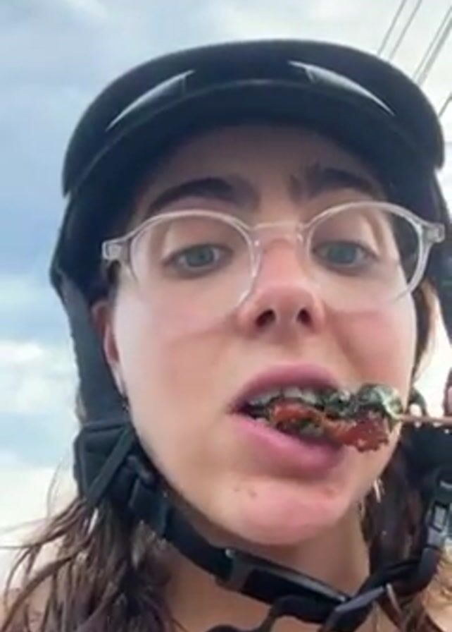 A woman with light skin, wearing a black helmet and clear glasses, is eating food on a stick. She has green eyes and curly brown hair. She looks directly at the camera while chewing. The background shows a cloudy sky and power lines. A sign with red and yellow colors is visible in the lower right corner of the frame.