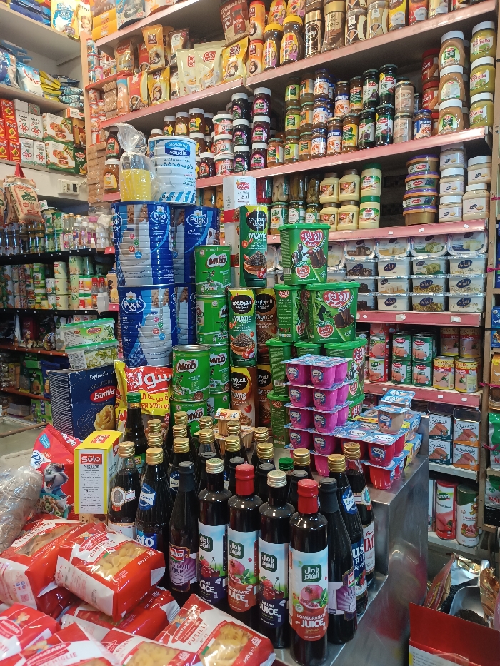 The image depicts the interior of a grocery store, specifically focusing on a retail aisle and a central display area. No individuals are present in the scene. In the foreground, a prominent display features multiple red-packaged pasta products, including fusilli, stacked on a lower shelf or counter. Adjacent is a white "Solo" brand box. To the right, numerous dark-bottled beverages, including "Ramallah al-Sharq" branded pomegranate juice and other syrups, are arranged on a metallic display unit. This unit also holds stacks of small, multi-colored plastic cups, likely containing yogurt or dessert. The midground features various product displays. On the left, a tall stack of blue and white "Puck" brand powdered milk cans is visible, topped by a clear plastic bag containing a yellow liquid. In the center, a large promotional arrangement includes green "Milo" branded beverage cans and red and black "Al-Rabih Thyme" seasoning cans. The background is dominated by densely packed shelves extending vertically and horizontally. The upper shelves are filled with an assortment of jars containing spreads, jams, and condiments, along with various packaged goods like coffee and cereals. Brands such as Nutella are identifiable. The lower and side shelves showcase a wide array of canned goods, bottled sauces, and other packaged food items, many bearing Arabic script. The lighting is bright and artificial, consistent with an indoor retail environment. The setting is a grocery store in an unspecified city.