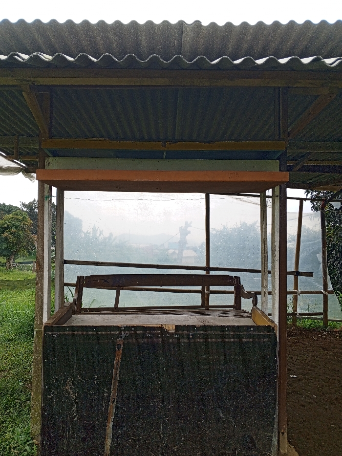An open structure with a corrugated roof, featuring a wooden frame and supporting metal poles, stands on a dirt and grass surface. The front is enclosed by a dark, textured panel. Inside, a weathered wooden bench sits against a background of hazy, translucent material. The surrounding environment includes grassy fields, trees, and indistinct landscape features in the distance, suggesting a rural or outdoor setting.