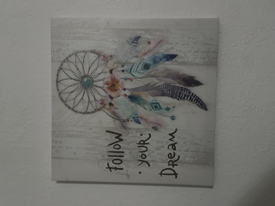 An indoor scene displays a square-format canvas print affixed to a textured, off-white wall. The print features a distressed light gray and white vertical plank background. On the left side of the print, the phrase "Follow your Dream" is rendered in a dark, handwritten-style font across three lines. On the right side, a stylized dreamcatcher illustration is depicted. It consists of a large, light-colored ring with an intricate web pattern, centered by a prominent teal bead or stone. Below the ring, multiple strands hang, adorned with various colored beads (red, pink, blue, green) and an assortment of feathers in shades of teal, blue, purple, brown, and pink, some exhibiting distinct patterns. Small floral elements in pink, orange, and green are also integrated into the dreamcatcher's design. No people or actions are visible. The specific location within Mindia, Bulgaria, cannot be determined from the provided image.