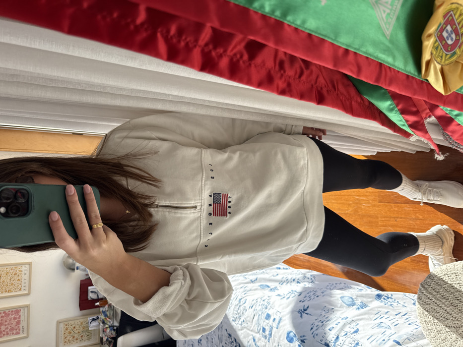 The image displays a female subject, partially obscured by a dark green smartphone, capturing her reflection in a mirror within an interior location identified as Vila Nova de Gaia, Portugal. The subject wears an off-white, quarter-zip sweatshirt with "LOS ANGELES 1984" text and an embroidered American flag, black leggings, white ribbed socks, and light-colored athletic shoes. A small gold cross pendant is visible on her neck, and a gold ring adorns her right ring finger. The reflected background features a bedroom with a bed covered in white and blue patterned bedding, a light-colored woven ottoman, and multiple framed art prints on a white wall. To the right of the subject, a white sheer curtain hangs, alongside three vertically draped ceremonial sashes or flags: a red one with fringed edges, a green one displaying a white emblem, and a yellow one featuring a distinct round crest with a Portuguese shield motif.