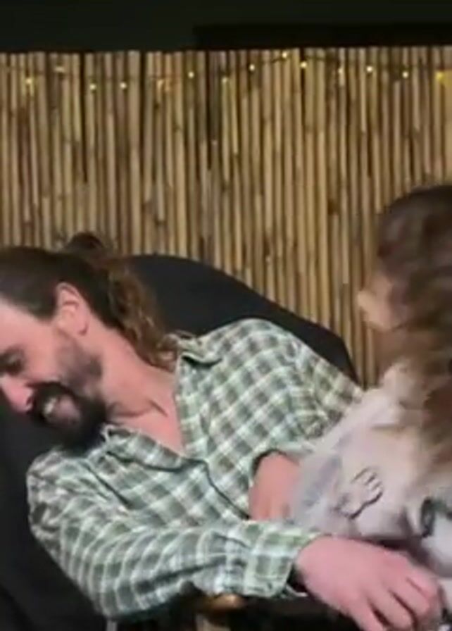 man sitting in a wooden chair outside, wearing a green and white plaid shirt. He has long brown hair tied back and a beard. A young child with curly brown hair is sitting on his lap. The child is tickling the man's face, and the man is smiling and laughing. Behind them is a fence made of bamboo. The child says something in what sounds like Hebrew about tickling his face, and the man responds.