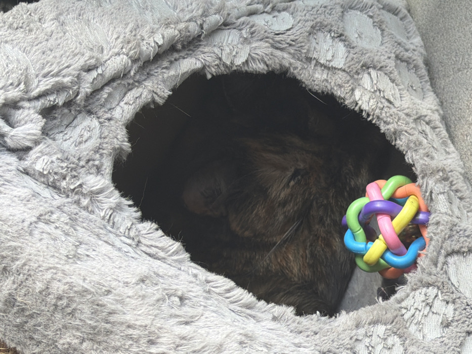 A gray, furry cat house with a circular opening is featured. Inside, a tabby cat is partially visible in the dark interior, seemingly asleep. A colorful, knotted ball rests near the opening. The cat's head is turned towards the viewer, with a hint of its whiskers and closed eyes visible. The textured surface of the cat house contrasts with the smooth, plastic toy.