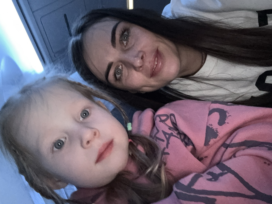 Two females are depicted in a close-up, low-angle selfie photograph within what appears to be the interior of an aircraft cabin, located in Al Hadaba, Egypt. On the left is a young Caucasian female child with light-colored hair styled in two braids, visible blue eyes, and light pink lipstick, wearing a pink hooded sweatshirt with dark grey abstract or graffiti-style graphics. Her expression is neutral, eyes wide and directed towards the camera. To the right is an adult Caucasian female with long, dark hair, blue-green eyes, and light pink lips, wearing a white long-sleeved top. She exhibits a subtle smile, with visible dimples on her cheeks. Both individuals are looking directly at the camera. The background is dimly lit, with horizontal light strips and overhead paneling characteristic of an airplane interior.