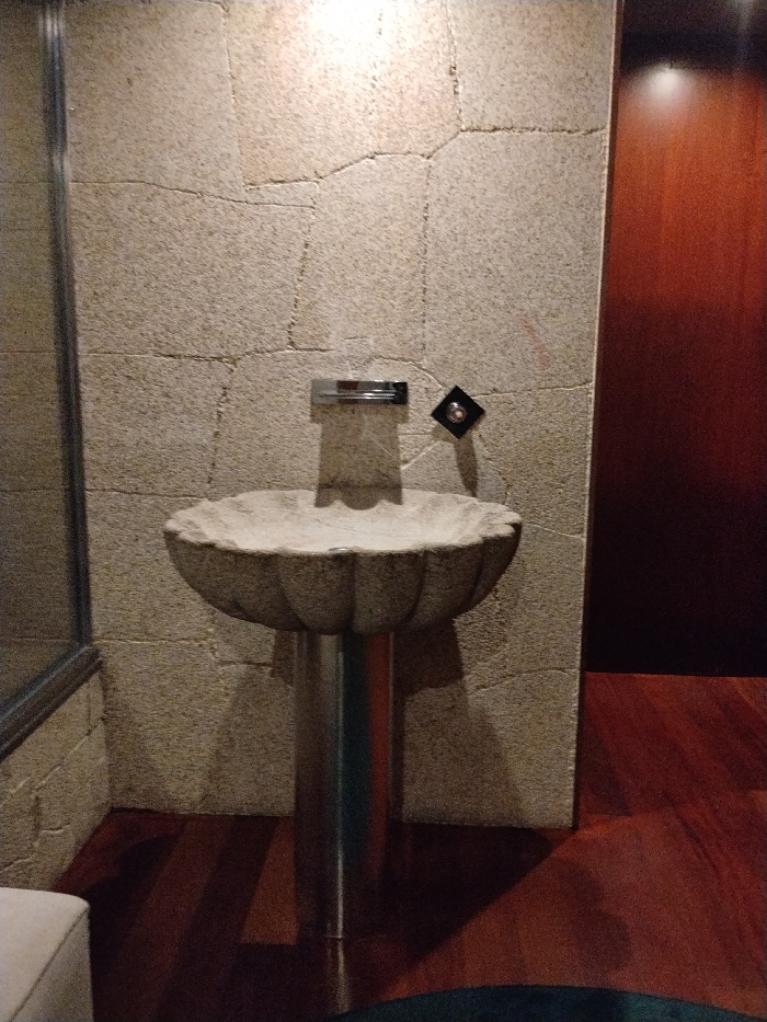 - "A pedestal sink with a stone basin and a chrome stand sits against a stone-tiled wall" by FM-xkd7v1, licensed under CC BY 4.0