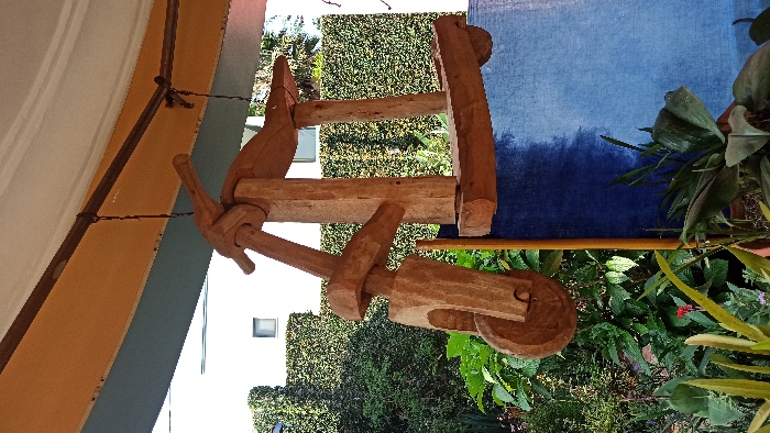A light brown wooden object hangs by a thin wire. It has a wheel shape and a handle attached to it. In the background, there is a wall with a white window and dense green bushes. The objects are positioned in front of a navy blue fabric backdrop, lush green plants, and colorful flowers. The image is taken from a low angle.