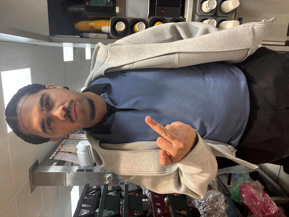 The image depicts the interior of a McDonald's restaurant kitchen or service area, located in Erstein, France. A single adult male is positioned centrally, facing directly towards the camera. The male has a dark complexion, dark hair styled in two prominent cornrows/braids from front to back with smaller braids on the sides, a mustache, and a short beard. He maintains a neutral facial expression. He is dressed in a light blue short-sleeved polo shirt with a black collar, featuring an embroidered "M" logo on the left chest, a black undershirt visible at the collar, and dark trousers. Over his polo shirt, he wears an unzipped light gray hooded sweatshirt. His right hand is raised to approximately chest level, with the middle finger extended upward in an offensive gesture directed towards the viewer. The background on the left includes stainless steel shelving units with several dark plastic baskets containing items wrapped in clear plastic, likely food products. On the right, a service station is visible, equipped with yellow dispensers on top, and multiple white paper or plastic cups stored in vertical dispensers below. Overhead square fluorescent light panels illuminate the scene.