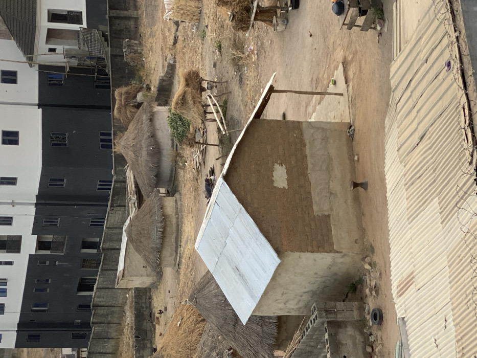A juxtaposition of housing styles is depicted in an outdoor scene. On the left, a modern, multi-story building with dark-framed windows rises. In contrast, the right side features traditional dwellings, including huts with thatched roofs and one with a corrugated metal roof. The buildings are interspersed with sandy ground and simple structures, suggesting a blend of rural and urban life. A narrow road runs through the scene.