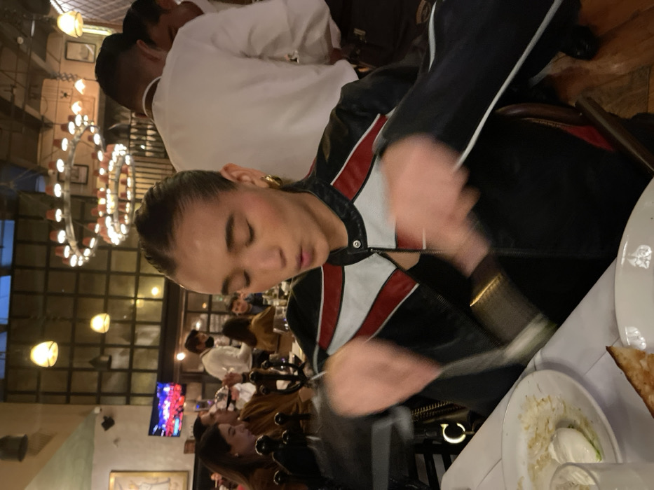 The image depicts an indoor scene within a busy, upscale casual restaurant identified as Trattoria La Grossa, located in Santiago de Querétaro, Mexico. The environment is dimly lit with warm artificial lighting, emanating from a distinctive large, circular chandelier with numerous small red shades and several individual pendant lights. Grid-patterned window partitions are visible in the background. A young adult female is the central subject, positioned in the foreground. She has dark hair pulled back and is wearing a black leather jacket with red and white horizontal stripe accents and gold hoop earrings. Her eyes are closed or directed downward, and her mouth is slightly open. Her hands are blurred, indicating motion as she uses a fork and knife over a white plate containing remnants of food, including what appears to be burrata and a piece of bread. In the background, several patrons are seated at various tables, and multiple male restaurant staff are visible, dressed in white collared shirts and dark trousers. One staff member stands directly behind the central figure. A flat-screen television displaying a colorful broadcast is mounted on a wall to the left. The table in the foreground is covered with a white tablecloth and features white plates, a glass of water, and a black bag with a gold 'C' insignia resting on a chair.