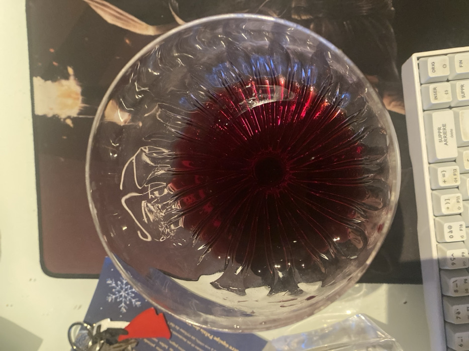 - "An overhead photograph depicts a clear, decorative glass goblet holding a quantity of dark red liquid, consistent with red wine" by FM-0FkkI2, licensed under CC BY 4.0