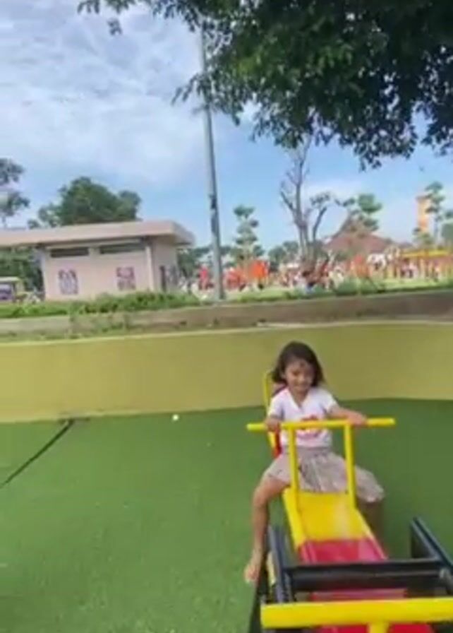 little girl enjoying a seesaw in a playground. The playground is an outdoor space with artificial green turf. The seesaw is made of metal and is painted in bright colors of red, yellow, and black. The girl is wearing a white T-shirt with a small heart and a light-colored skirt. She is barefoot. She is smiling and seems happy as she plays on the seesaw. The background features other playground equipment and structures, including buildings with orange decorations. There is a tall tree that partially covers the upper right corner. The sky is partly cloudy. A light pole is visible in the background.
