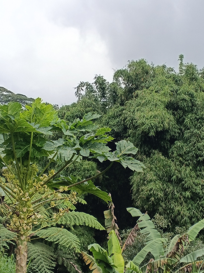 Lush tropical vegetation dominates the frame. A young papaya tree, identifiable by its large, palmate leaves and emerging flowers, stands prominently in the foreground. Behind it, a dense thicket of bamboo creates a wall of green. Banana plants with broad leaves are interspersed at the lower right, adding to the jungle-like atmosphere. The sky is overcast, casting a soft, diffused light over the scene.