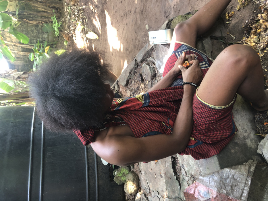 In an outdoor setting in Orifite, Nigeria, a person with dark skin and voluminous dark, tightly curled hair is seated on a cracked concrete slab. The individual is clad in a red, black, and white patterned wrap garment, draped over the left shoulder and around the lower body, leaving the right shoulder and arm exposed. A black beaded bracelet is visible on the left wrist. The person is leaning forward, with their head bowed, intently manipulating several small, reddish-orange, fibrous objects held in their left hand. To the left of the individual, a large black ribbed plastic water storage tank is partially visible. The background to the right features dense green tropical foliage, including broad leaves, and a segment of a concrete block wall. The ground consists of reddish-brown soil and fractured concrete, with scattered organic debris. Natural daylight illuminates the scene.
