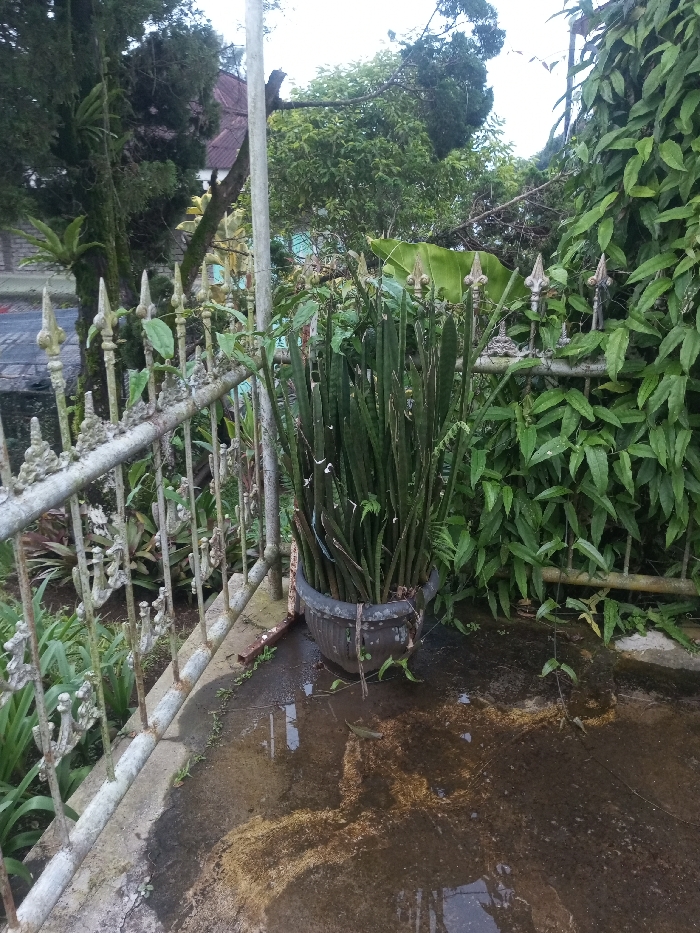 The image displays an outdoor residential or garden scene in Unknown, Vietnam, characterized by dense vegetation and a wet environment. In the foreground, a dark, wet concrete or paved surface shows multiple reflections from puddles. A large, dark grey fluted plastic pot centrally holds numerous upright, dark green Sansevieria (snake plant) leaves. To the left, an aged, light-colored metal railing with ornate, pointed finials on its vertical bars runs diagonally across the frame; it exhibits rust or discoloration. Vines and green foliage are intertwined with this railing. Beyond the railing, the midground and background are densely packed with various green plants, trees, and broad leaves. A large, light green leaf, possibly from a banana plant, is visible behind the potted Sansevieria. On the far left, a tree trunk with an attached epiphyte (fern) is present. In the upper background, partially obscured by foliage, a structure with a reddish-brown tiled roof and light-colored walls is visible, and a light-colored utility pole extends vertically near the center. The sky appears overcast. No human figures are present.