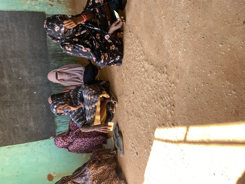 The image displays an interior scene in Omdurman, Sudan, featuring six individuals, presumed female, seated on a sandy-brown dirt floor
