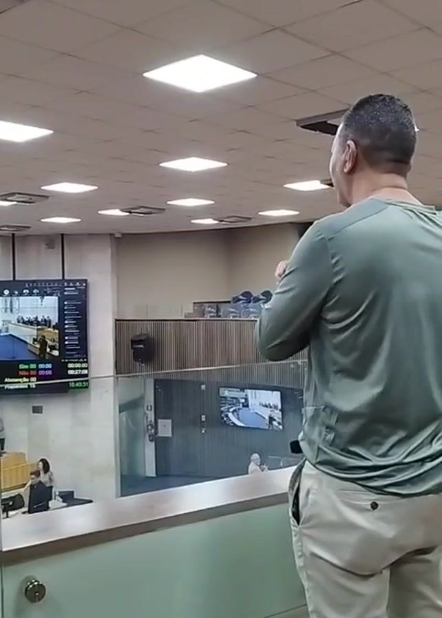 A man in a green shirt and tan pants stands behind a glass barrier looking into a room, calling out to the people below. He is facing toward the room. There is a large screen on the wall that shows a live feed of the room. There is a cross hanging on the wall. Several people are in the room below. A sign that reads, "NÃO SE APOIE NO VIDRO," is visible on the glass barrier.