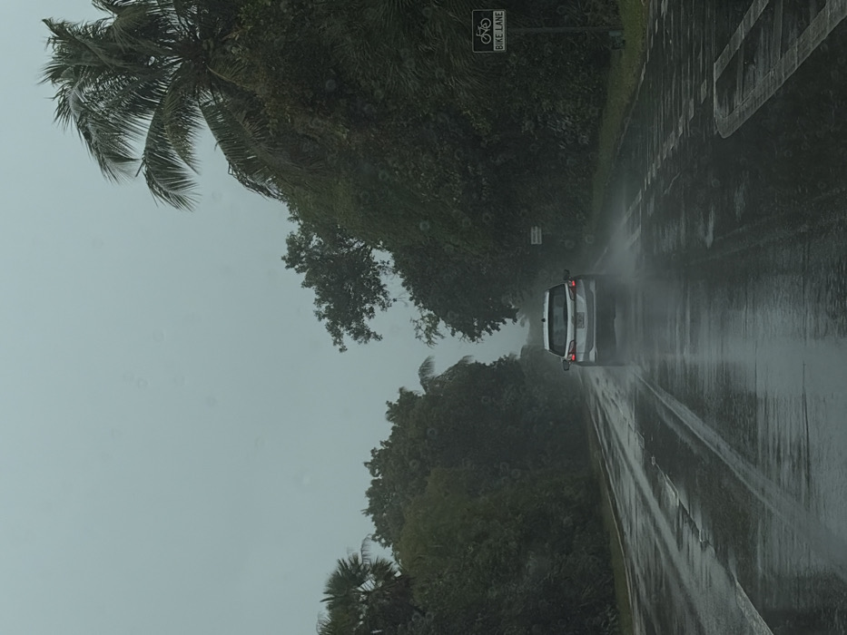 A silver car drives on a rain-soaked road lined with lush green trees. Tire tracks are visible in the water on the asphalt. A "Bike Lane" sign stands alongside the road, partly obscured by the dense vegetation. The sky is overcast, and the general atmosphere is damp and gray due to the heavy rain. Palm trees are visible, adding a tropical feel to the scene.