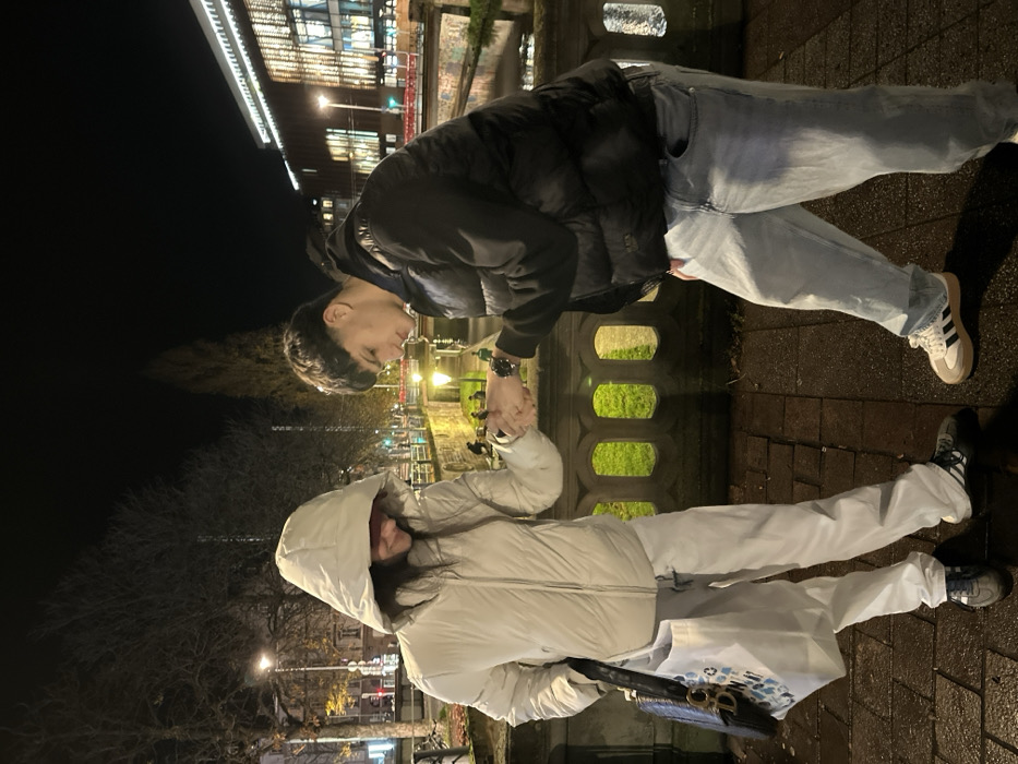 Two individuals, one in a dark jacket and jeans and the other in a light-colored hooded jacket and pants, stand facing each other. They hold hands near a ledge, possibly a bridge, with green light visible behind it. The background features a building illuminated with lights and a dark sky, indicating it's nighttime. A bare tree is also visible on the left side. The ground appears to be wet.