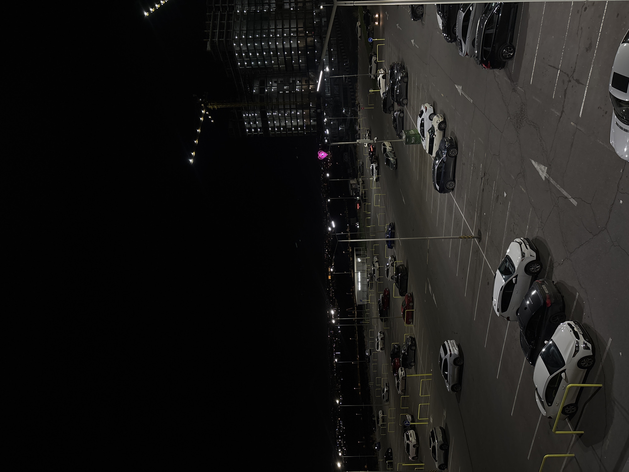 The image depicts an outdoor parking lot at night, illuminated by rows of streetlights. The lot is filled with parked cars of various colors and models, separated by painted parking lines. White arrows painted on the asphalt indicate the direction of traffic flow within the lot. In the background, a tall building under construction is visible, its structure outlined with numerous lights. A construction crane is positioned near the building. Further in the distance, a pink glowing structure is discernible. The foreground is dominated by darkness, with only faint hints of the surrounding environment visible.